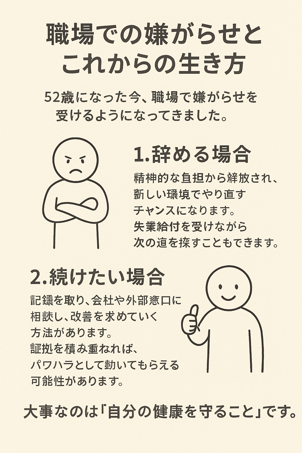 52歳になった今、職場で嫌がらせを受けるようになってきました。内容は陰口、粗探し、そして仕事の指示を与えないといったものです。自分としては普通に働いているつもりでも、なぜかターゲットにされることが増えてきました。こうした状況が続くと、心も体...