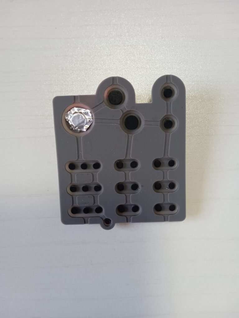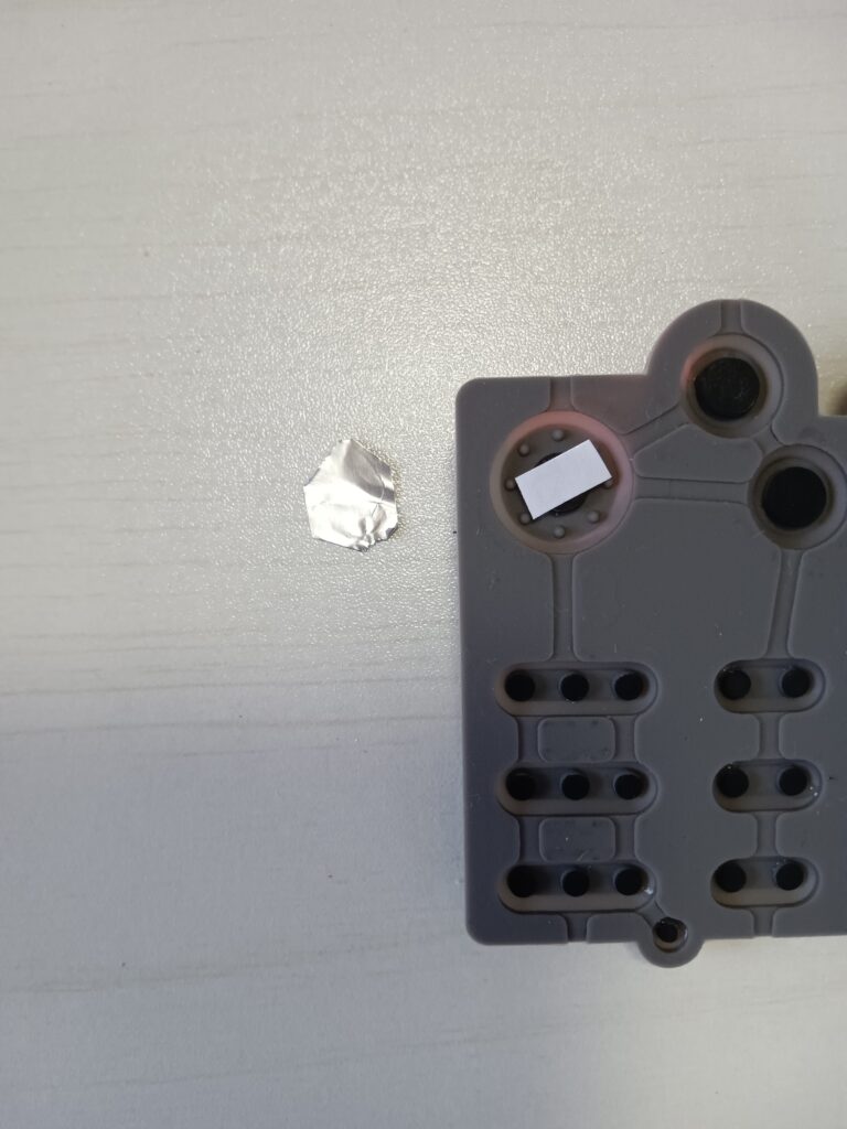 ボタンの接触部分の大きさにカットしたアルミホイルを貼り付ける