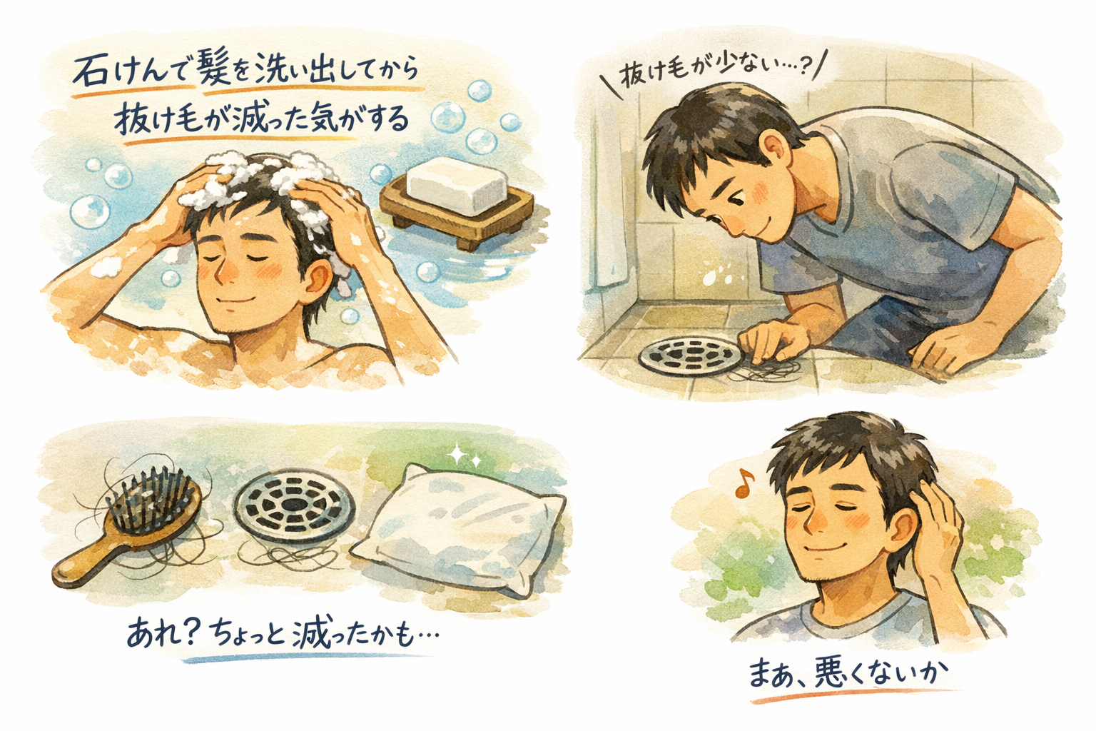 気のせいか、石けんで髪を洗い始めてから抜け毛が減った気がする